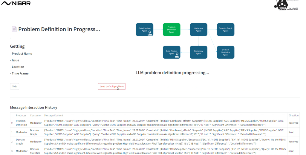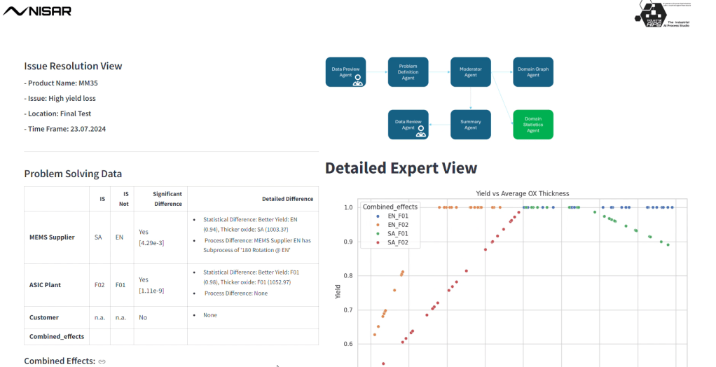 Ein Team aus sieben Agenten analysiert das Problem – interaktiv mit den Experten. Zunächst stellt ein Agent den Experten Fragen, um das Problem einzugrenzen, dann übernimmt ein Strategieagent, der die Strategie zur Problemlösung umsetzt. Spezielle Datenverarbeitungsagenten analysieren Zeitreihendaten. Spezielle Datenanalyseagenten erstellen Diagramme anhand von Eingaben in menschlicher Sprache. Jeder Analyseschritt und die Endergebnisse werden den Experten zur Überprüfung vorgelegt. Die Experten gewinnen Zeit, um sich auf die kritischen Aspekte zu konzentrieren, während die Agenten die mühsame Arbeit übernehmen.